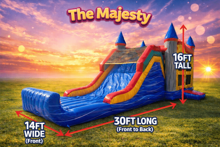 Feel like a King (or queen) of the castle with The Majesty! This red, blue and yellow combo includes both a bounce house and slide. Perfect for all ages!